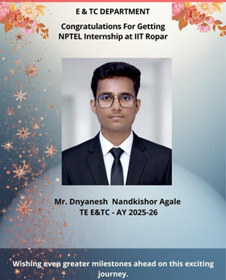 Dnyanesh Agale, a student of TE E&TC, has been selected for the 4-Week NPTEL Winter Internship at IIT Ropar. |