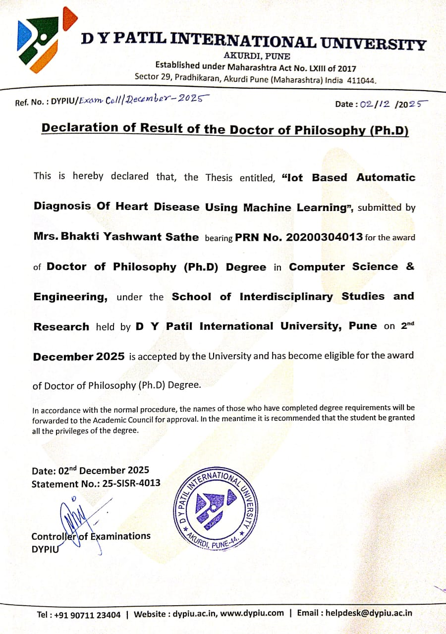 Dr. Bhakti Yashwant Sathe has recently Completed his Ph.D. in Computer Science & Engineering. |