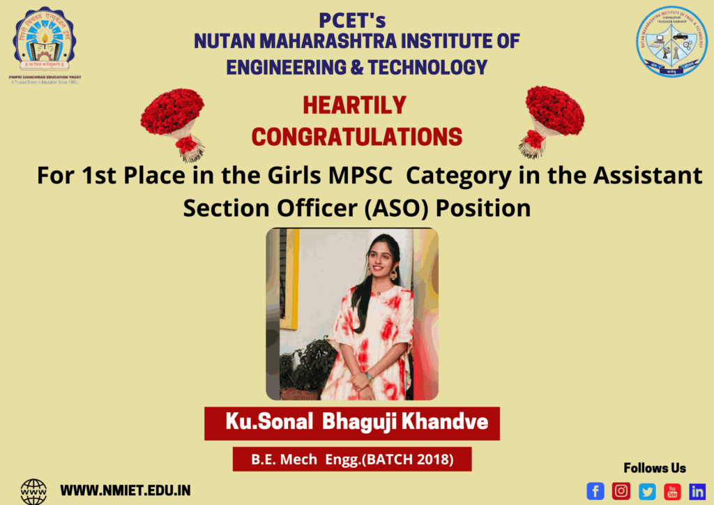 Congratulations ! to Sonal Khandve, a Mechanical Engineering Department (Batch 2018) alumini who ranked first in the MPSC Girls Category for the ASO Position. NMIET Family congratulates you.